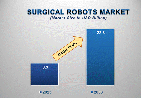 The Surgical Robots Market is projected to witness significant growth between 2025 and 2033, driven by the increasing number of surgical procedures hip and knee replacement surgeries. Valued at approximately USD 8.9 billion in 2025, the market is expected to soar to USD 22.8 billion by 2033, reflecting a strong compound annual growth rate (CAGR) of 13.0% over the next ten years.
