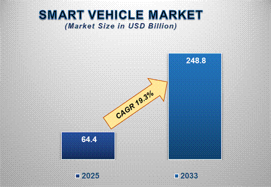 The global smart vehicle market is witnessing transformative growth, fueled by advancements in artificial intelligence (AI), sensor technologies, and automotive digitization. Valued at USD 64.4 billion in 2025, the market is projected to reach USD 248.8 billion by 2033, growing at a CAGR of 19.3%. The ongoing shift toward connected, electric, and autonomous mobility, accelerated by government initiatives and industry collaborations, is reshaping the automotive ecosystem.