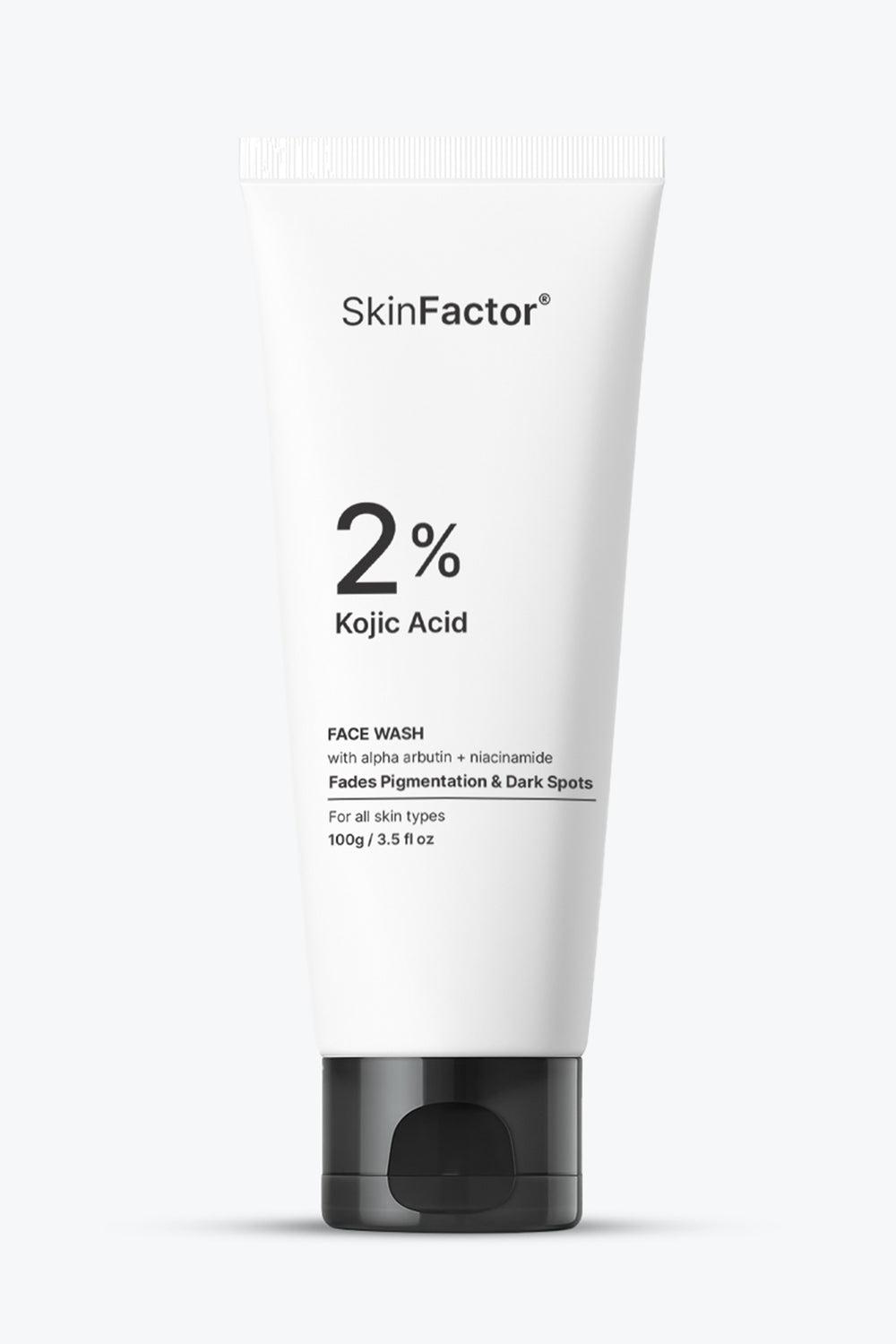 Reduces Pigmentation: skinfactor Kojic acid face wash fades Pigmentation & dark spots, sun damage, and acne scars — leaving a smooth, even complexion.