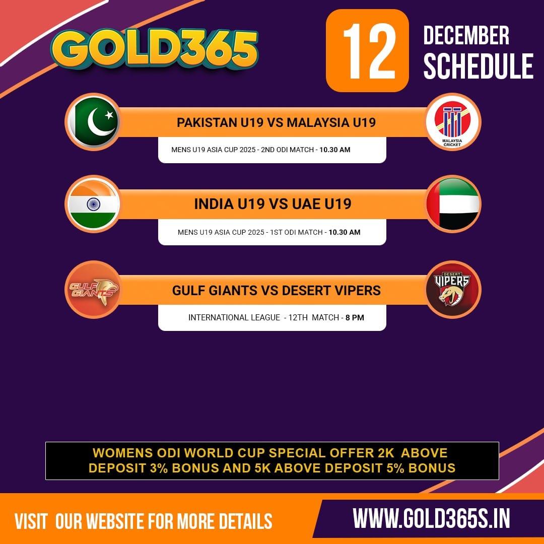 December 12 features three major fixtures across the U19 Asia Cup 2025 and the International League T20. Fans using gold365 login, gold365 id, gold365loginidindia, and the growing gold365 site community will be tracking every innings live. The Gold365 platform, along with gold365 sign up and apna gold365 access points, ensures users stay updated with verified match insights, expert analytics, and real-time statistics.