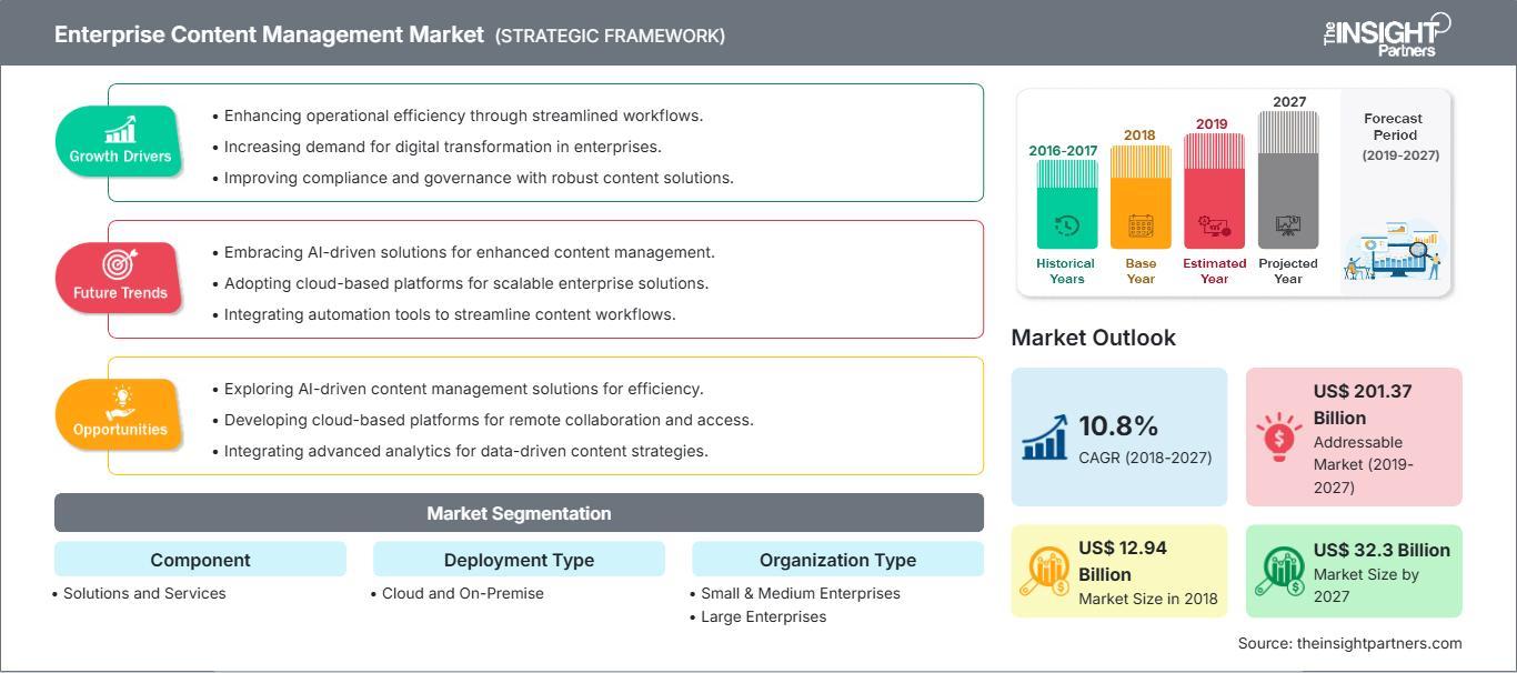 The Enterprise content management market is expected to grow from US$ 12.94 billion in 2018 to US$ 32.30 billion by 2027; it is estimated to grow at a CAGR of 10.8% during 2019–2027.