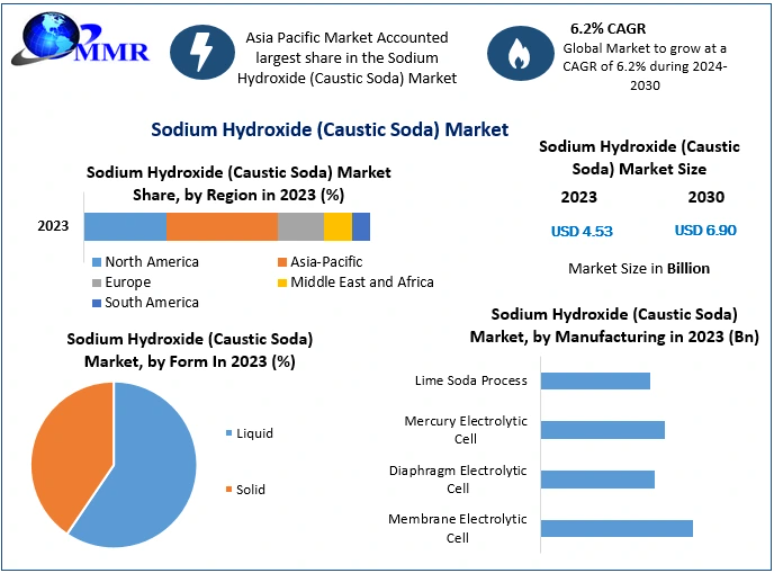 The global Sodium Hydroxide (caustic soda) Market was valued at USD 4.53 billion in 2023 and is projected to expand at a CAGR of 6.2% from 2024 to 2030, reaching approximately USD 6.90 billion by the end of the forecast period. The market growth is being driven by rising industrial applications, increasing demand from the food and beverage sector, and expanding use in energy and chemical manufacturing processes.