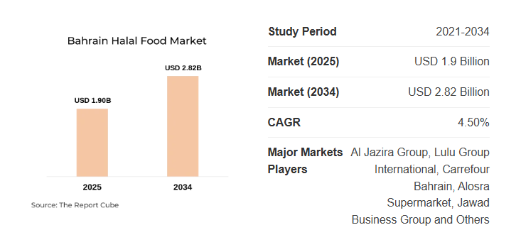 According to the Bahrain Halal Food Market Research Report (2026-2034) by Report Cube, the market was valued at approximately USD 1.9 Billion in 2025. Based on current industry structure and observed demand patterns, the market is projected to reach USD 2.82 Billion by 2034, expanding at a 4.50% CAGR during the forecast timeline.