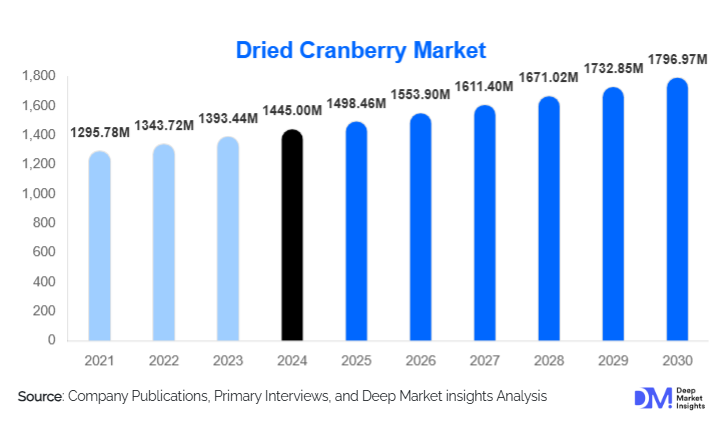 According to Deep Market Insights, the global dried cranberry market size is projected to grow from USD 1498.46 Million in 2025 to reach USD 1796.97 Million by 2030, expanding at a CAGR of 3.7% during the forecast period (2025–2030).
