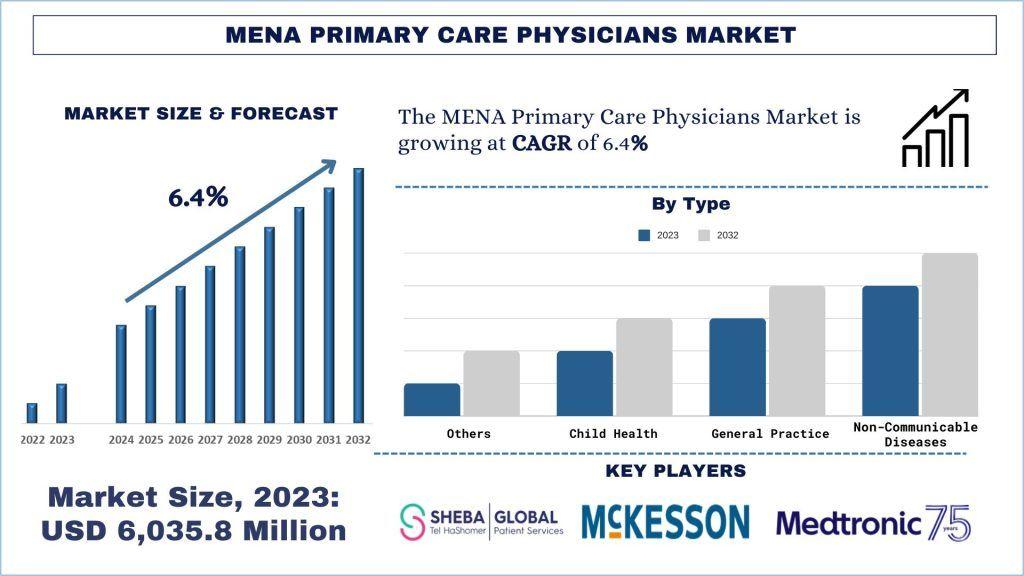 According to UnivDatos, the rising prevalence of chronic diseases across the Middle East and North Africa (MENA) region is a key factor driving demand for primary care physicians (PCPs). As outlined in the MENA Primary Care Physicians Market report, the market was valued at USD 6,035.82 million in 2023 and is projected to grow at a CAGR of 6.4% during the forecast period (2024–2032), reaching USD million by 2032.