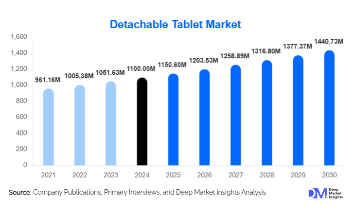 According to Deep Market Insights, the global detachable tablet market size is projected to grow from USD 1150.6 Million in 2025 to reach USD 1440.73 Million by 2030, expanding at a CAGR of 4.6% during the forecast period (2025–2030).
