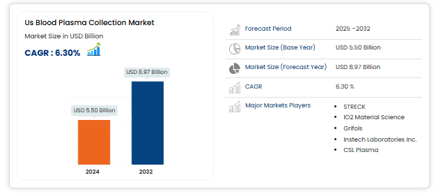 The U.S. blood plasma collection market size was valued at USD 5.50 billion in 2024 and is expected to reach USD 8.97 billion by 2032, at a CAGR of 6.3% during the forecast period