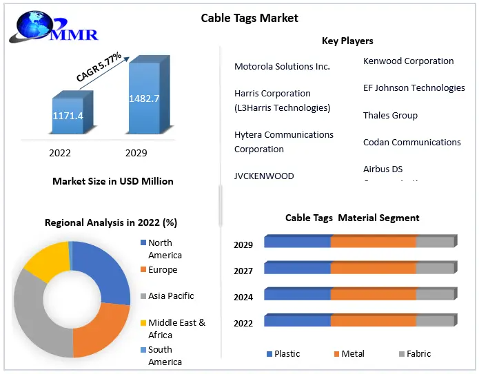 Cable Tags Market is projected to grow at a CAGR of 5.77% during the forecast period, from 2023 to 2029, to reach a market size of USD 1482.7 million by 2029, up from USD 1171.4 million in 2022.