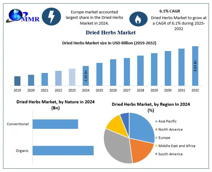 The global Dried Herbs Market is witnessing steady and resilient growth, underpinned by rising demand for processed and convenience foods, increasing awareness of natural and organic ingredients, and the expanding use of herbs across food, pharmaceutical, cosmetic, and personal care industries. Valued at USD 5.50 Billion in 2024 , the market is expected to grow at a CAGR of 6.1% from 2025 to 2032 , reaching nearly USD 8.84 Billion by 2032 .