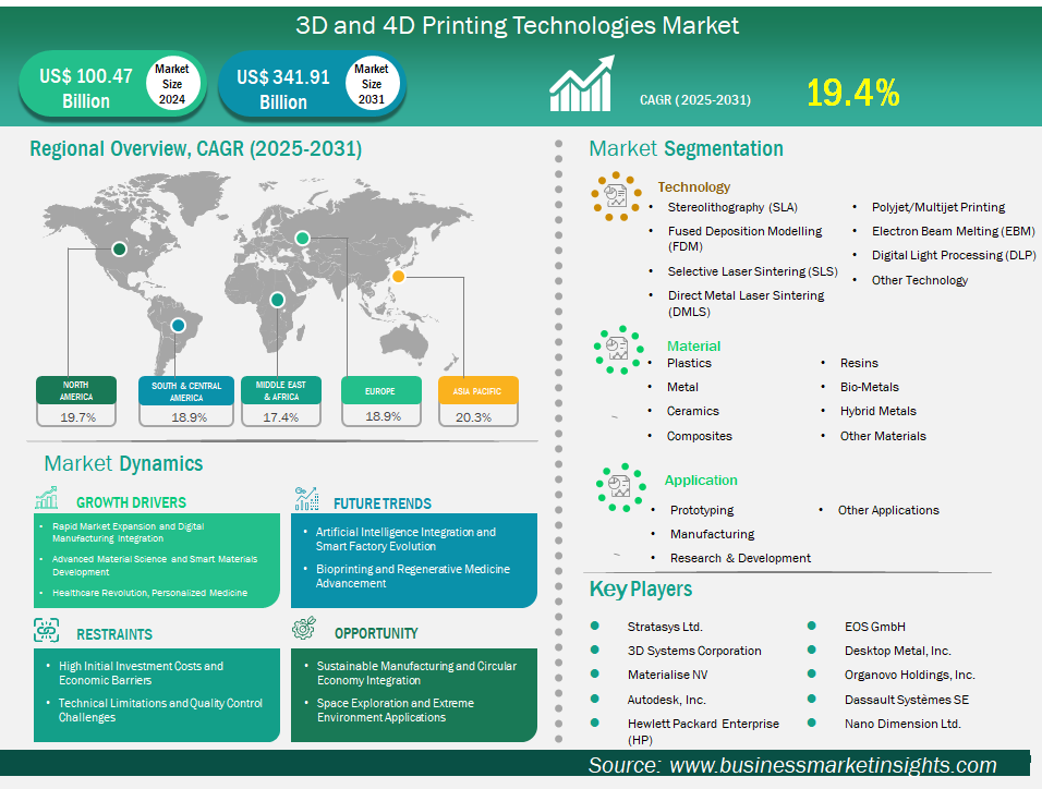 According to the Business Market Insights The Global 3D and 4D Printing Technology Market is on a transformative trajectory, with its market size expected to reach US$ 341,935.81 million by 2031 , up from US$ 100,479.73 million in 2024 . According to the latest industry analysis, the market is projected to record a robust CAGR of 19.4% from 2025 to 2031 , fueled by innovations in additive manufacturing, rising demand for customized production, and expanding applications across the healthcare, aerospace, and automotive sectors.