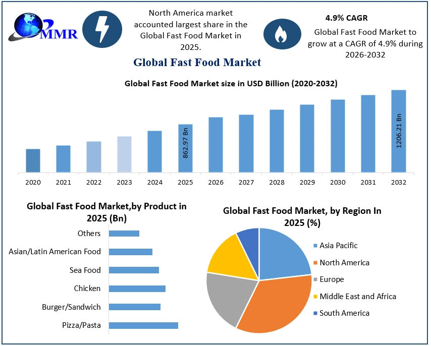The global Fast Food Market continues to be one of the most dynamic and influential segments of the global food and beverage sector. Driven by changing consumer lifestyles, rapid urbanization, and the increasing need for convenient meal options, fast food has evolved from a niche dining concept into a mainstream consumption pattern across both developed and emerging economies. According to recent market analysis, the global Fast Food Market was valued at USD 862.97 Billion in 2025 and is projected to grow at a compound annual growth rate (CAGR) of 4.9% from 2025 to 2032 , reaching nearly USD 1,206.21 Billion by 2032 . This sustained growth highlights the sector's resilience and adaptability in the face of shifting consumer preferences, regulatory pressures, and technological transformation.