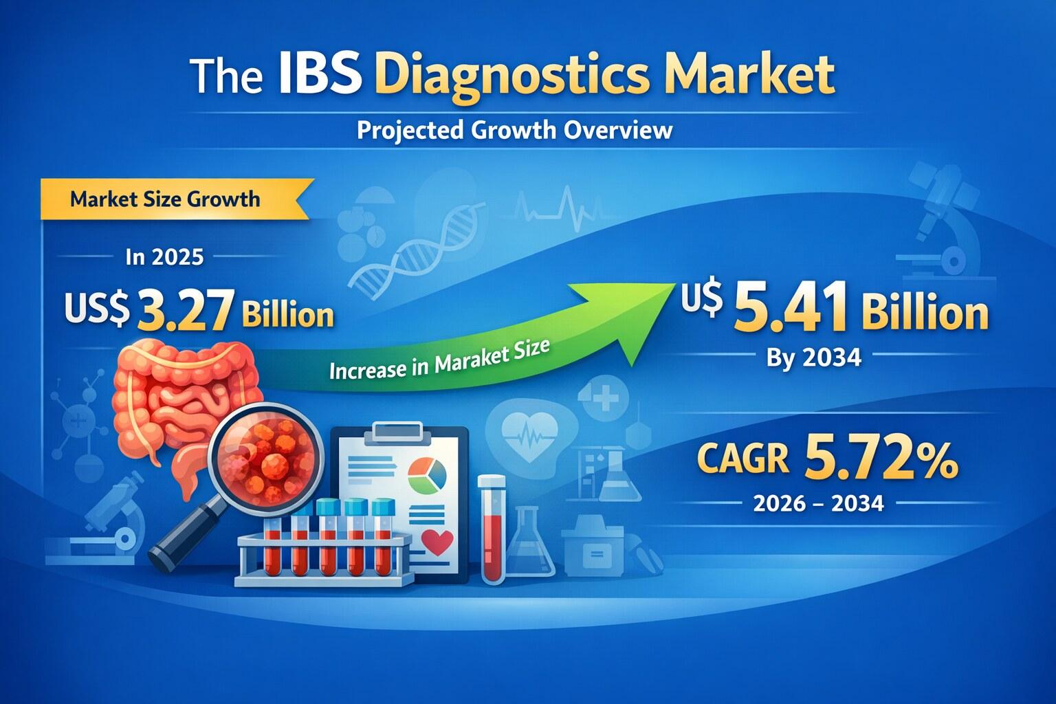 The Irritable Bowel Syndrome Diagnostics Market is projected to grow from US$ 3.27 billion in 2025 to US$ 5.41 billion by 2034, registering a CAGR of 5.72% during 2026 to 2034. This steady expansion reflects the increasing global burden of gastrointestinal disorders and the growing need for accurate, accessible, and patient friendly diagnostic solutions. IBS affects nearly 10 to 16 percent of the global population, making it one of the most common functional gastrointestinal conditions worldwide.