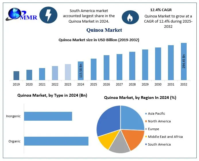 According to the latest market analysis, the global quinoa market was valued at USD 115.58 Billion in 2024 and is anticipated to grow at a compound annual growth rate (CAGR) of 12.4% from 2025 to 2032 , reaching nearly USD 294.45 Billion by 2032 . This strong growth trajectory reflects sustained demand across both developed and emerging economies, supported by innovation, expanding applications, and evolving dietary patterns.