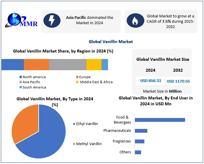 The Global Vanillin Market , valued at USD 656.33 Mn in 2024 , is projected to grow at a robust CAGR of 7.5% between 2025 and 2032 , reaching nearly USD 1,170.55 Mn by 2032 . Vanillin, the primary flavor compound responsible for the characteristic taste and aroma of vanilla, continues to expand its footprint across food & beverages, pharmaceuticals, fragrances, cosmetics, and personal care industries. Market growth is being propelled by evolving consumer preferences for natural ingredients, health-conscious formulations, global culinary experimentation, and sustainable manufacturing practices.