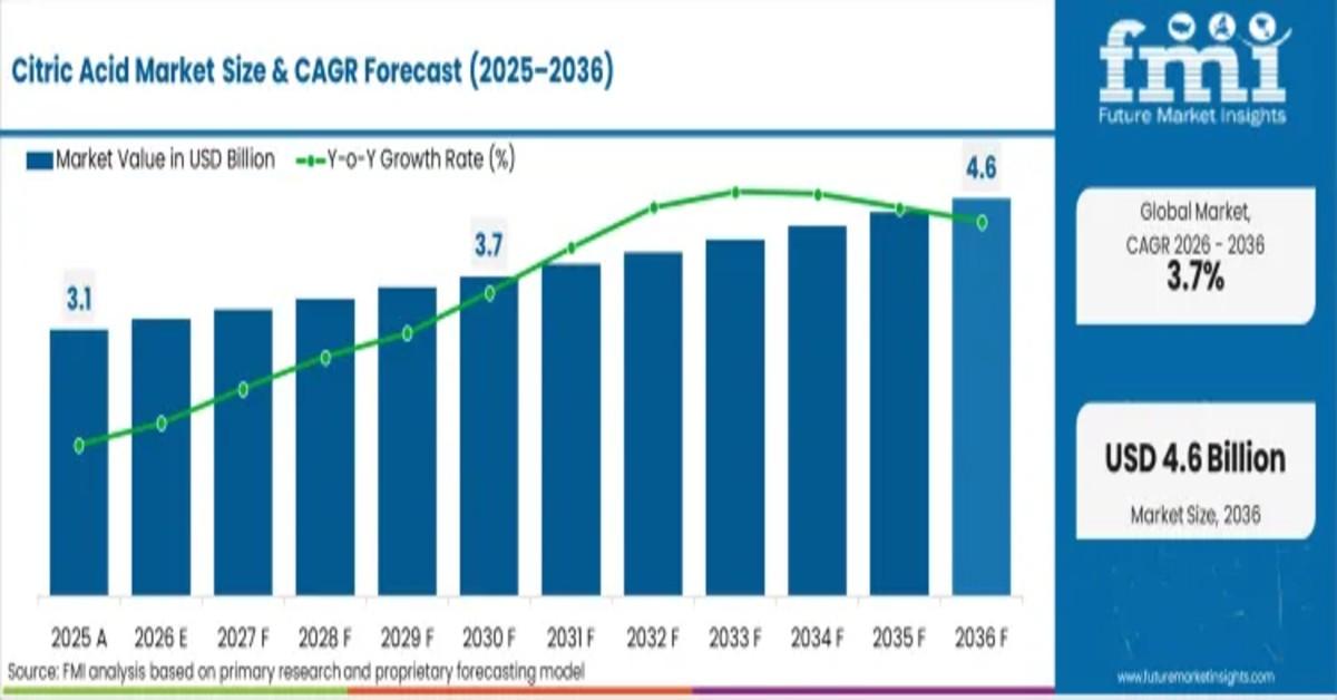 The global citric acid market has entered a phase of calibrated, efficiency-led expansion, with valuation crossing USD 3,179.1 million in 2025. According to new analysis by Future Market Insights (FMI), the market is projected to grow to USD 3,296.1 million in 2026 and further to USD 4,741.3 million by 2036, reflecting a steady CAGR of 3.7% over the forecast period.