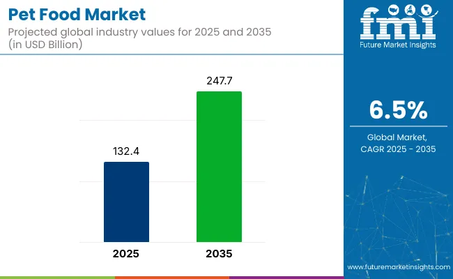 - The global pet food market is projected to grow from USD 132.4 billion in 2025 to USD 247.7 billion by 2035.