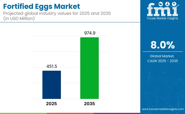 The global fortified eggs market is witnessing strong momentum as consumers increasingly seek functional foods that deliver added health benefits without disrupting everyday diets. According to the latest industry analysis, the market is valued at USD 451.5 million in 2025 and is projected to reach USD 974.9 million by 2035, expanding at a robust 8.0% CAGR over the forecast period.