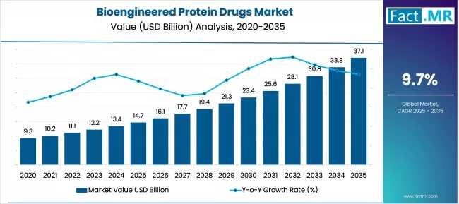 The global bioengineered protein drugs market is entering a decade of high-velocity growth, with its valuation projected to surge from USD 14.7 billion in 2025 to USD 37.0 billion by 2035. According to a comprehensive strategic outlook by Fact.MR, the industry will expand at a CAGR of 9.7%, fueled by a global mandate to combat non-communicable diseases (NCDs) and the rapid integration of personalized medicine into clinical practice.