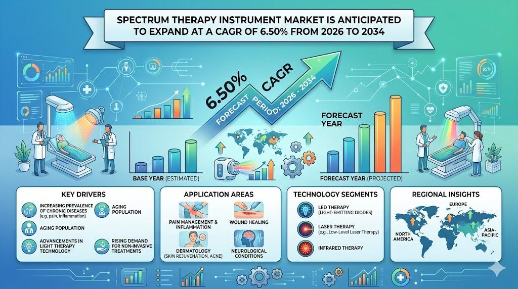 The Spectrum Therapy Instrument industry is witnessing steady growth as healthcare providers, wellness centers, and homecare services increasingly adopt advanced light-based therapeutic technologies. Spectrum therapy instruments utilize specific wavelengths of light or carbon-based light sources to treat chronic pain, neurological disorders, dermatological conditions, and musculoskeletal issues. Rising demand for noninvasive, patient-centric treatments, along with the growing availability of portable devices, is driving adoption across hospitals, beauty centers, specialty clinics, and homecare settings.  The Spectrum Therapy Instrument Market is anticipated to expand at a CAGR of 6.50% from 2026 to 2034 , reflecting steady progress and long-term potential fueled by innovation, patient awareness, and expanding healthcare infrastructure worldwide.