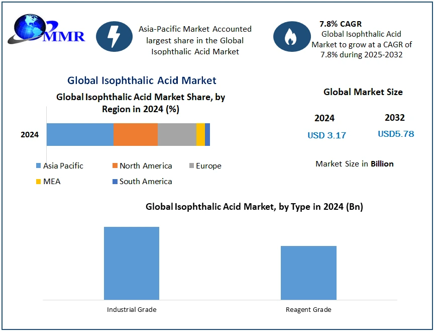 The global Isophthalic Acid Market is witnessing significant expansion, fueled by increasing demand across packaging, coatings, and industrial applications. According to the latest industry analysis, the market was valued at USD 3.17 Billion in 2024 and is projected to grow at a CAGR of 7.8% from 2025 to 2032, reaching approximately USD 5.78 Billion by 2032. The steady rise in consumption of high-performance resins, coupled with rapid industrialization and evolving consumer lifestyles, is shaping the future trajectory of the market.