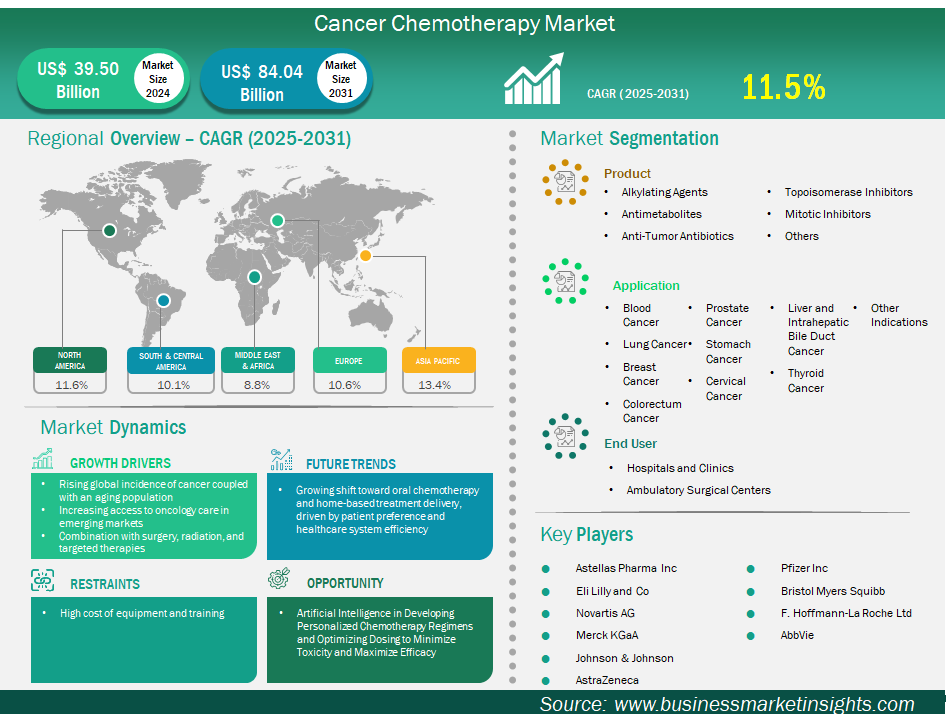 The global Cancer Chemotherapy Market features a highly competitive landscape shaped by global pharmaceutical giants investing heavily in oncology pipeline development, regulatory approvals, and geographic market expansion. This Cancer Chemotherapy Market Competitive analysis examines the key players competing across therapy types including alkylating agents, antimetabolites, anti-tumor antibiotics, topoisomerase inhibitors, and mitotic inhibitors, across indications from lung cancer and breast cancer to blood cancer, colorectum cancer, prostate cancer, stomach cancer, cervical cancer, liver and intrahepatic bile duct cancer, and thyroid cancer, distributed through hospital pharmacies, retail pharmacies, and online stores, in a market projected to grow from US$ 39,509.70 million in 2024 to US$ 84,044.04 million by 2031 at a CAGR of 11.5%.