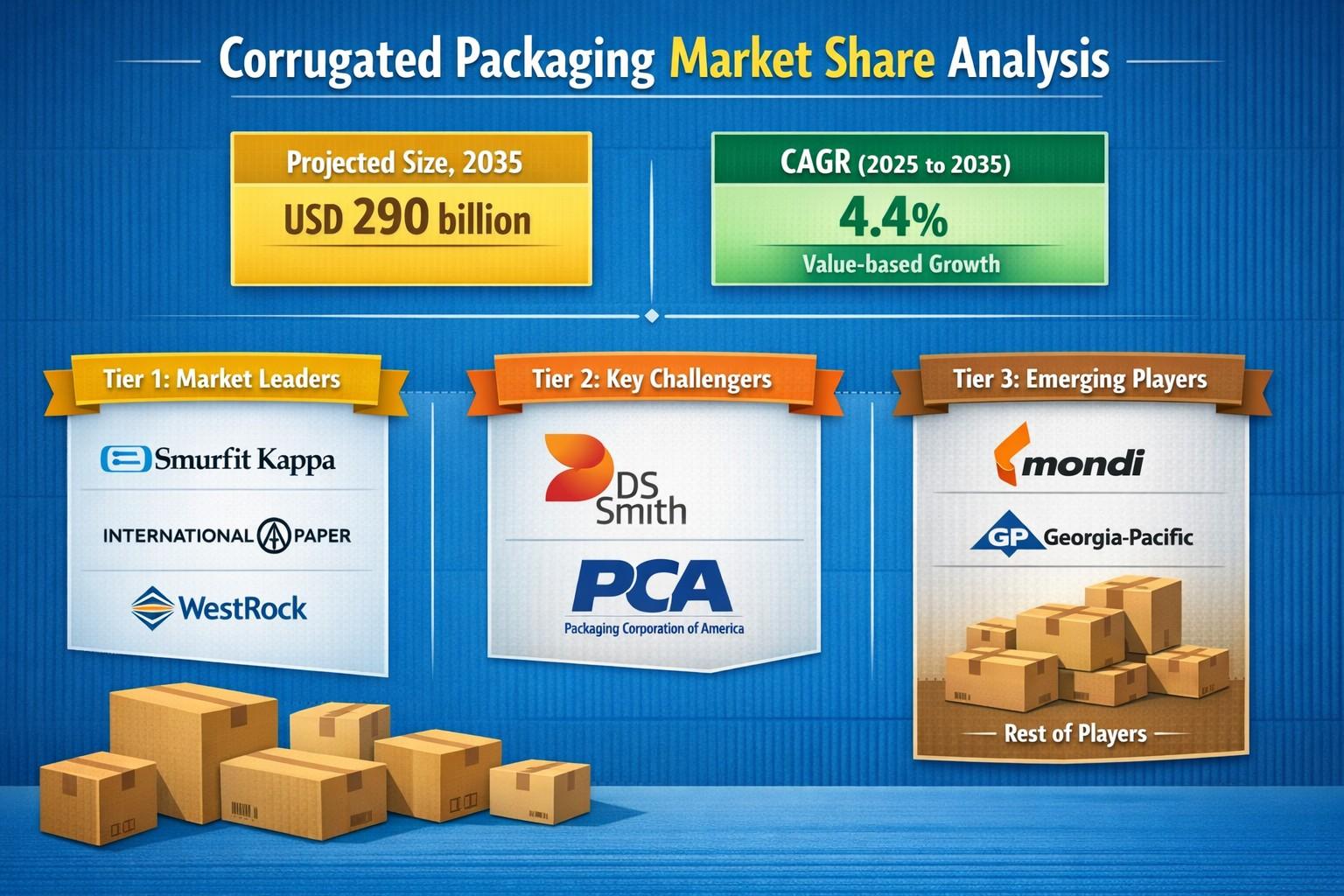 The Corrugated Packaging Market is projected to reach USD 290 billion by 2035, expanding at a CAGR of 4.4% during 2025–2035. Growth in the Corrugated Packaging Market is being driven by increasing demand for sustainable, lightweight, and protective packaging solutions across industries including e-commerce, food & beverages, and pharmaceuticals. Companies such as Smurfit Kappa, International Paper, and WestRock are shaping the competitive landscape through technological innovation, recyclable materials, and smart packaging solutions. As global logistics networks expand and sustainability initiatives intensify, the Corrugated Packaging Market continues to evolve as a critical component of modern supply chains.