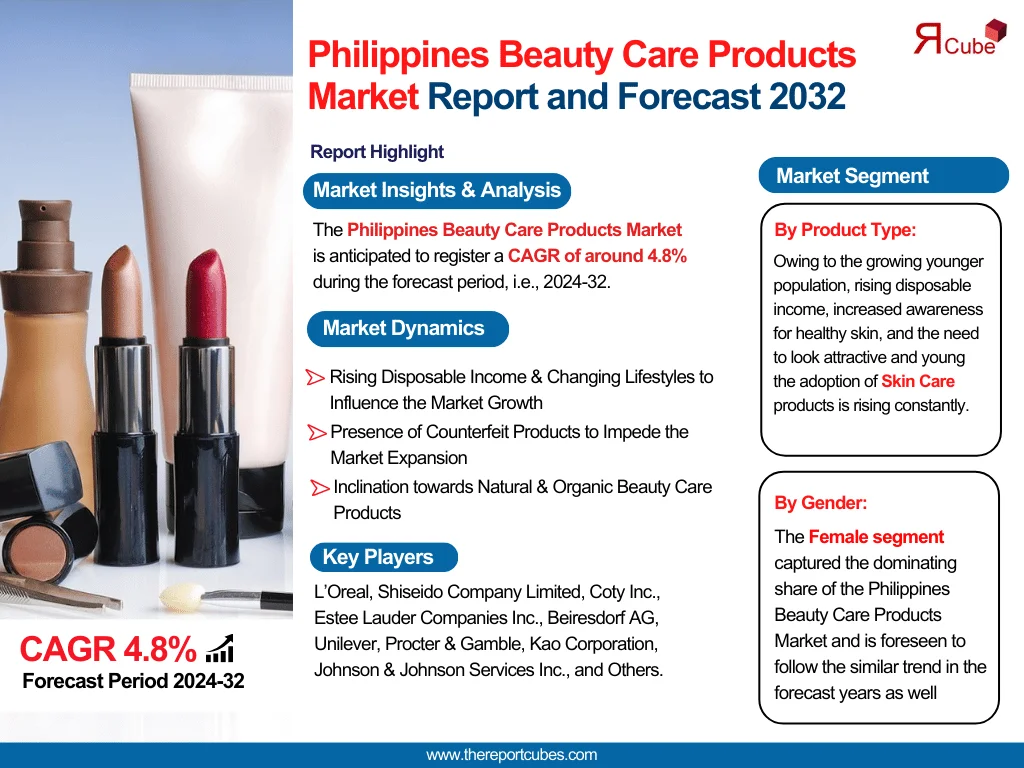 The new research report reveals that the Philippines Beauty Care Products Market is projected to grow significantly, reaching approximately USD 5.49 billion by 2032, at a CAGR of 4.8%.