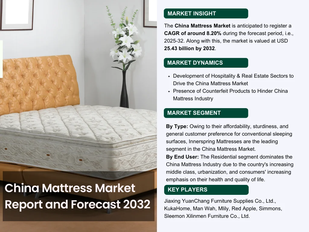 The China Mattress Market is anticipated to register a CAGR of around 8.20% during the forecast period, i.e., 2025-32. Along with this, the market is valued at USD 25.43 billion by 2032. The mounting population, increasing incomes, and flourishing housing sector in China are all foreseen to contribute to the market growth.