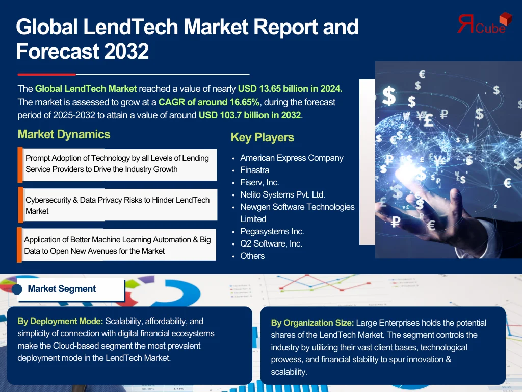 LendTech Market Growth Drivers, Challenges, and Forecast 2025–2032 Market Size (2024): USD 13.65 billion Market Size (2032): USD 103.7 billion CAGR (2025–2032): 16.65% Top Companies in LendTech Market: American Express Companys, Finastra, Fiserv, Inc., Nelito Systems Pvt. Ltd., Newgen Software Technologies Limited, Pegasystems Inc., Q2 Software, Inc., Roostify, Inc., Visa, Inc., Others. https://www.thereportcubes.com/report-store/lendtech-market